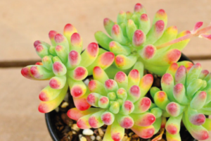 Esta es una suculenta de tipo rastrera, así que crece bastante rápido y como característica le pueden crecer raíces aéreas. Es bastante resistente a las altas temperaturas y al recibir el sol directo sus puntas se tornan en color rojo. Es una suculenta para principiantes bastante gratificante de coleccionar, ya que, resulta bastante vistosa con tan solo un poco de cuidados.
