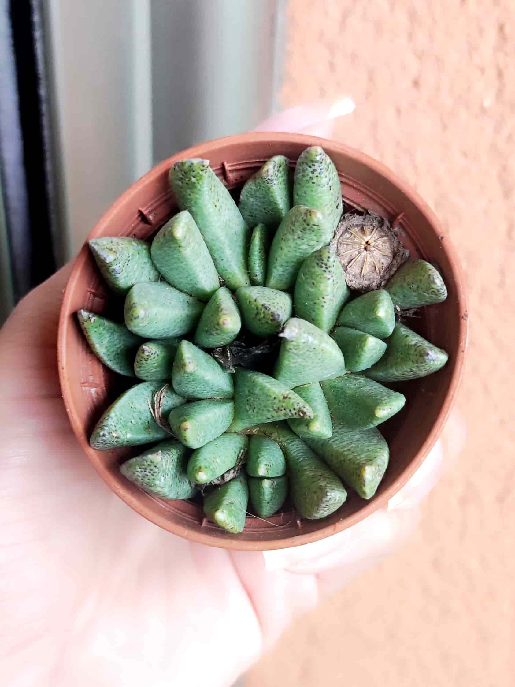 La Haworthia Mirabilis es una suculenta pequeña con rosetas de hojas triangulares y translúcidas, de tonos verde oscuro a marrón, con patrones únicos en su superficie.