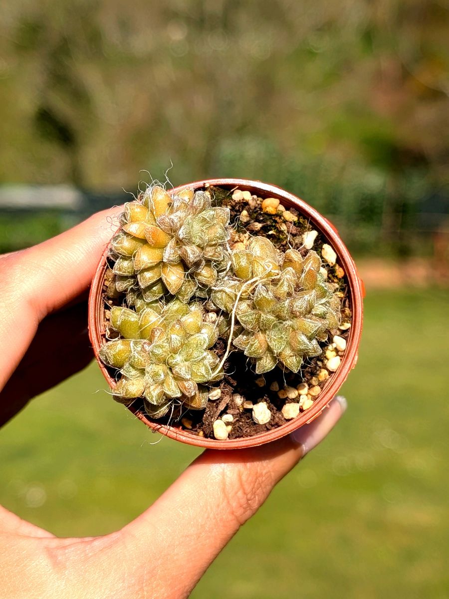 La Anacampseros Arachnoides es una suculenta exótica de pequeño tamaño, con hojas verdes y carnosas cubiertas por finos vellos blancos que le dan un aspecto similar a una telaraña.