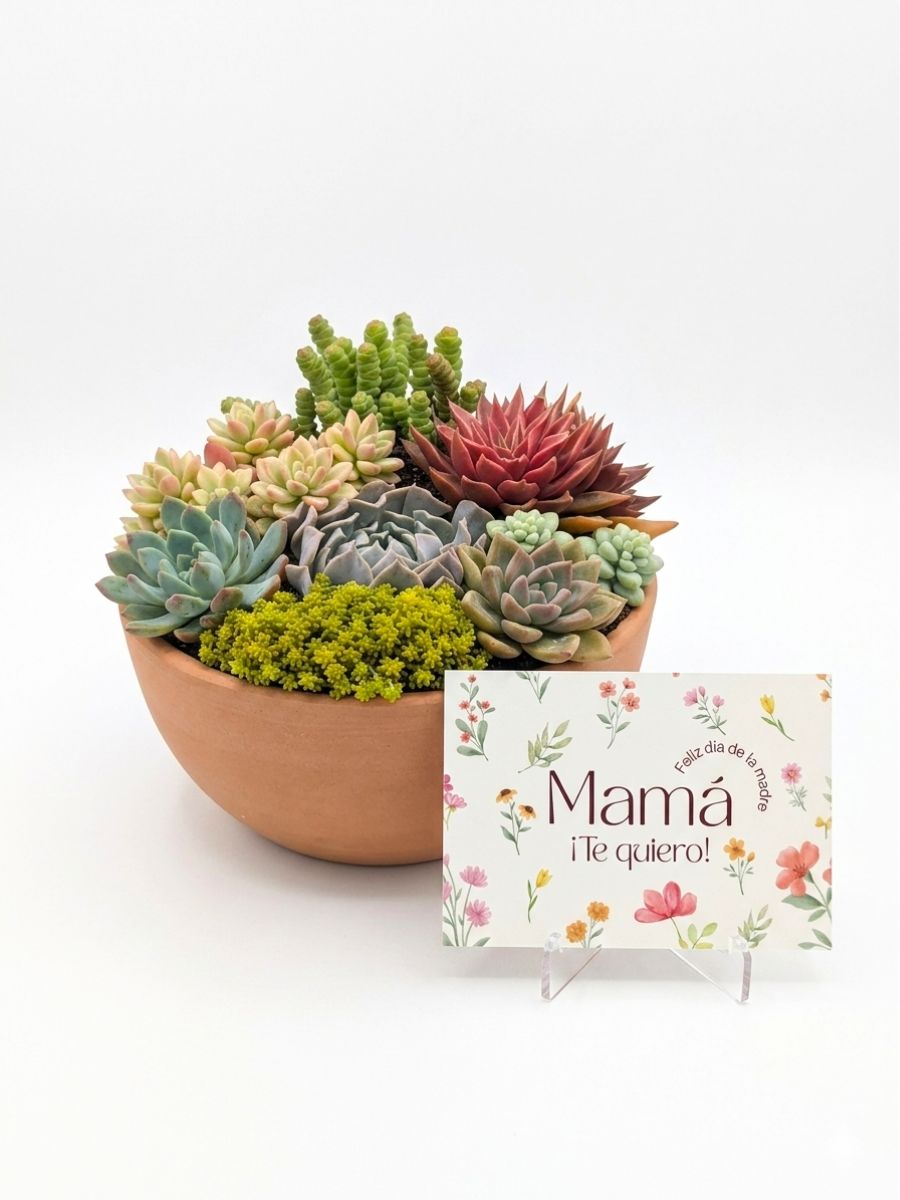 Un cuenco de fantasía y color para mamá, con 8 suculentas cuidadosamente seleccionadas 💖. Composición Suculentas Fantasy combina la belleza natural de las plantas con la calidez de la terracota en un formato bajo y ancho, perfecto para lucir todas sus formas y tonos. Ideal para el Día de la Madre, su cumpleaños o cualquier ocasión especial.