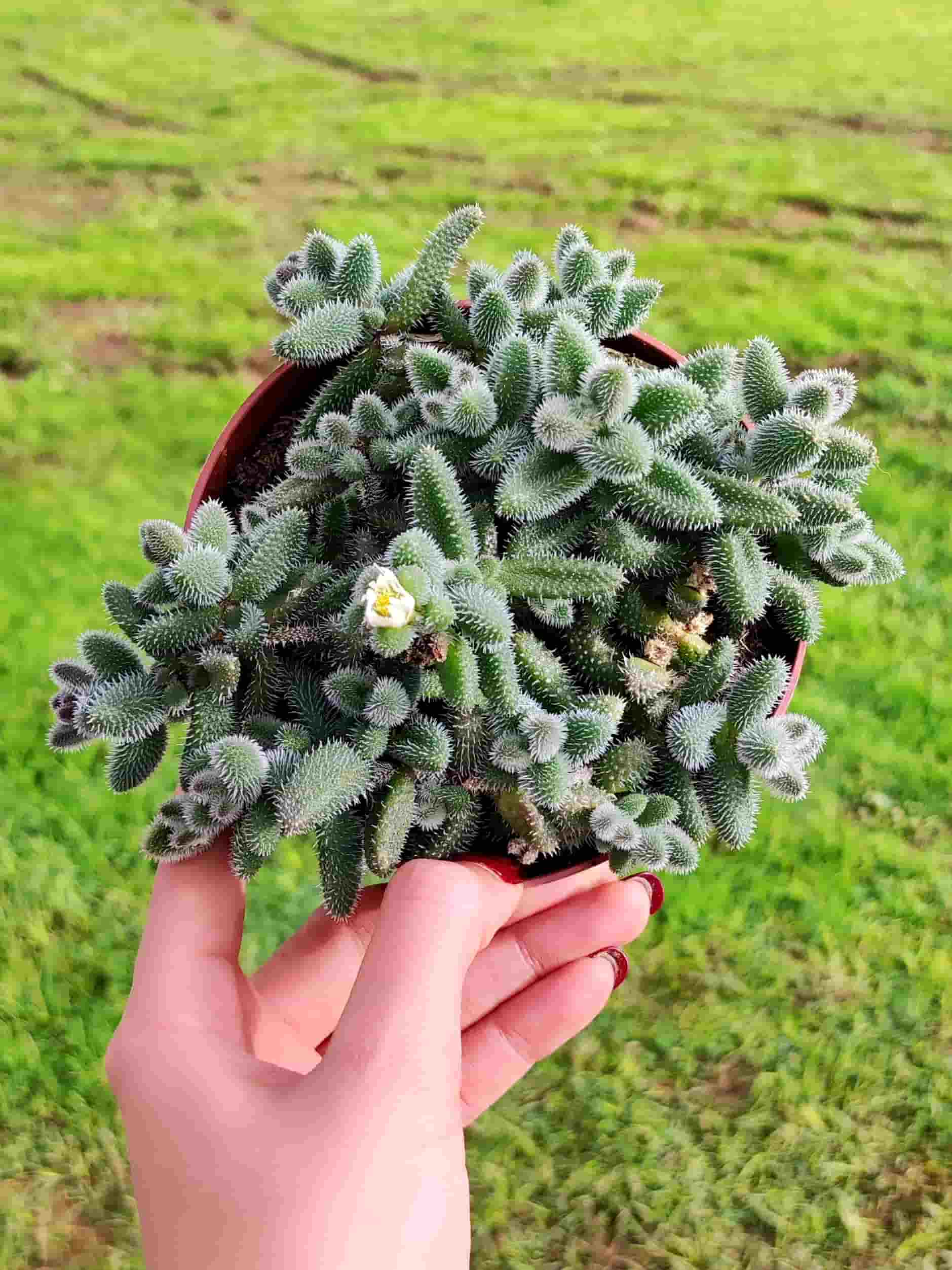 El Delosperma Echinatum es una suculenta ornamental de porte arbustivo con hojas verdes cubiertas de pequeños pelillos blancos que le dan aspecto espinoso, apreciada por su forma curiosa, resistencia y fácil cuidado.