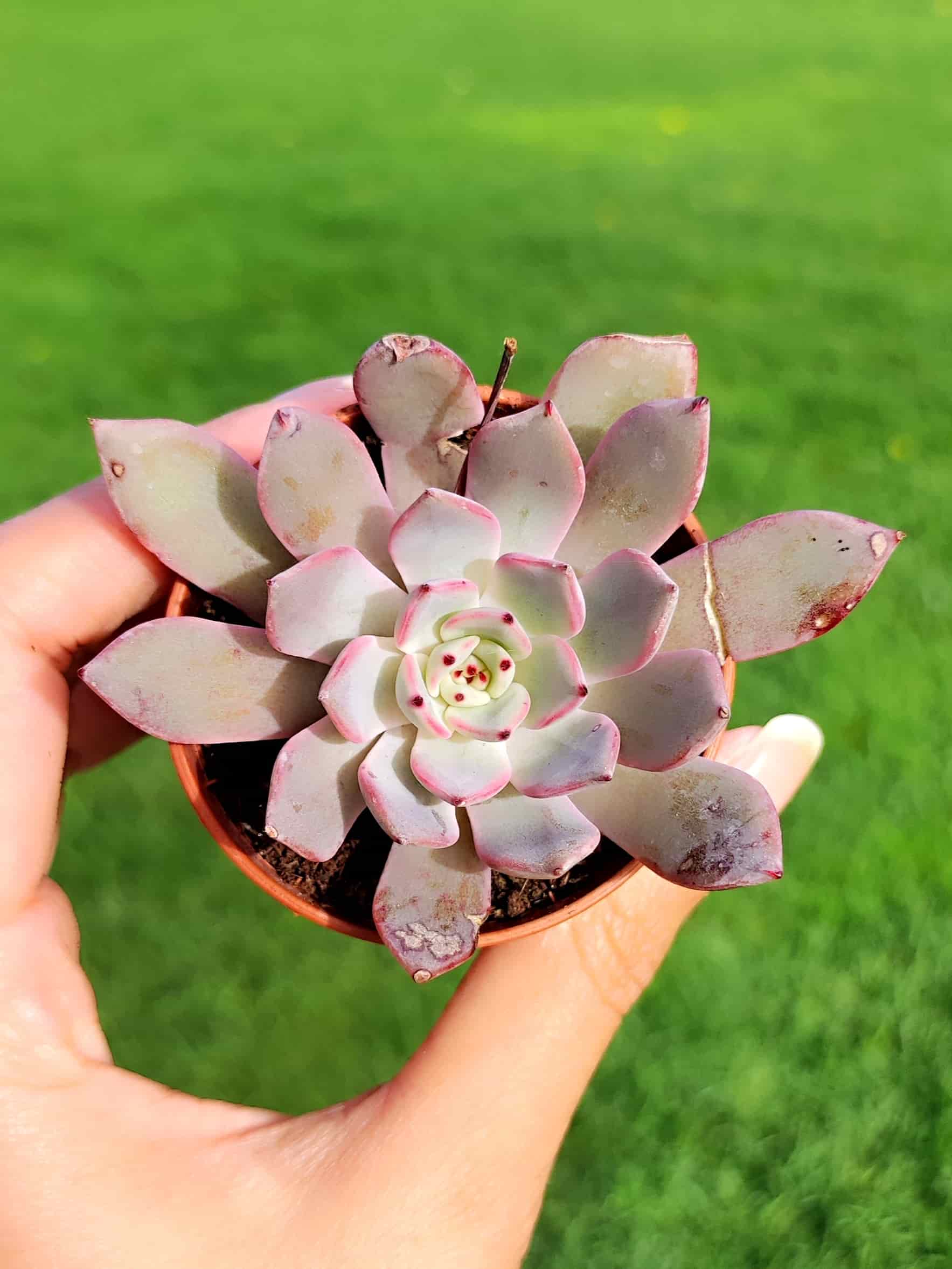 La Echeveria Cuspidata White Mexican Rose es una suculenta de roseta simétrica con hojas puntiagudas de tono verde pálido a blanquecino, que adquieren bordes rosados con el sol.
