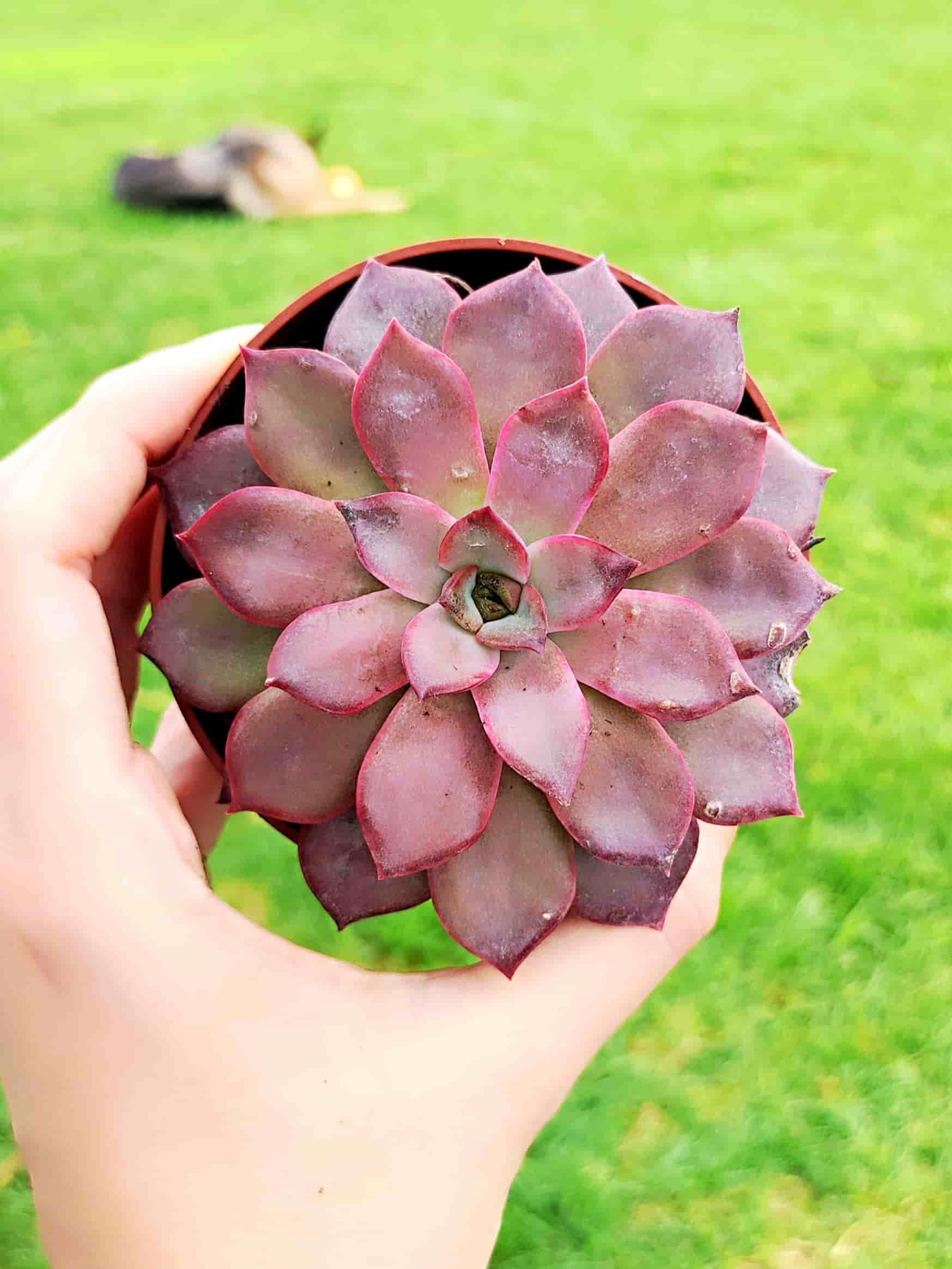 La Echeveria Mina es una suculenta de roseta compacta con hojas carnosas en tonos púrpura-rosados que se intensifican con la luz.
