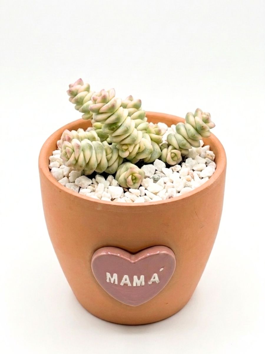 🔸 Maceta de barro de Ø9 cm con agujero de drenaje: Decorada con un corazón de cerámica hecho a mano con la palabra “Mamá”.