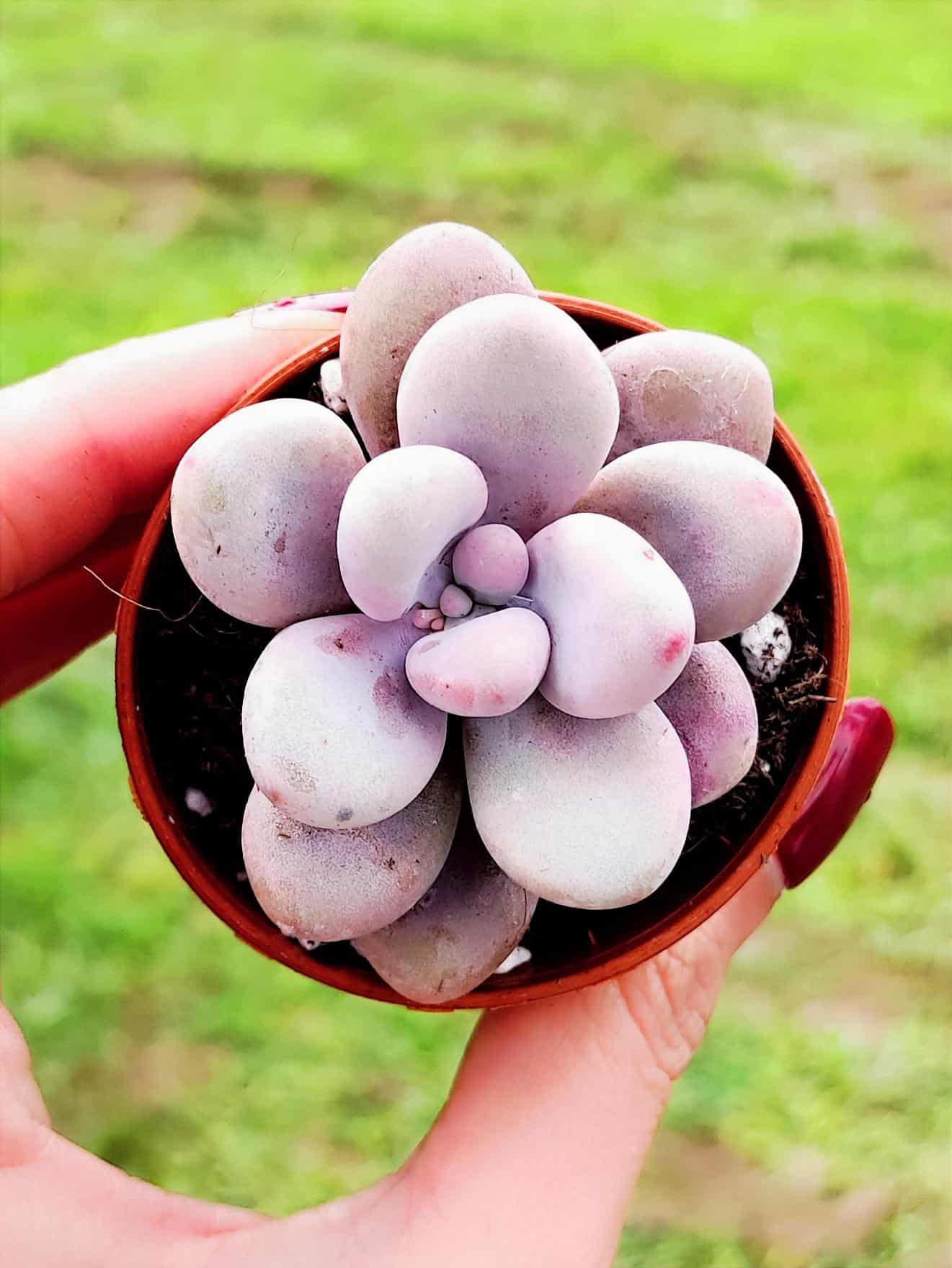 El Pachyphytum Oviferum Pink es una suculenta ornamental con rosetas de hojas muy carnosas y redondeadas de color rosado a lila, apreciada por su apariencia delicada, tonos suaves y fácil cultivo.