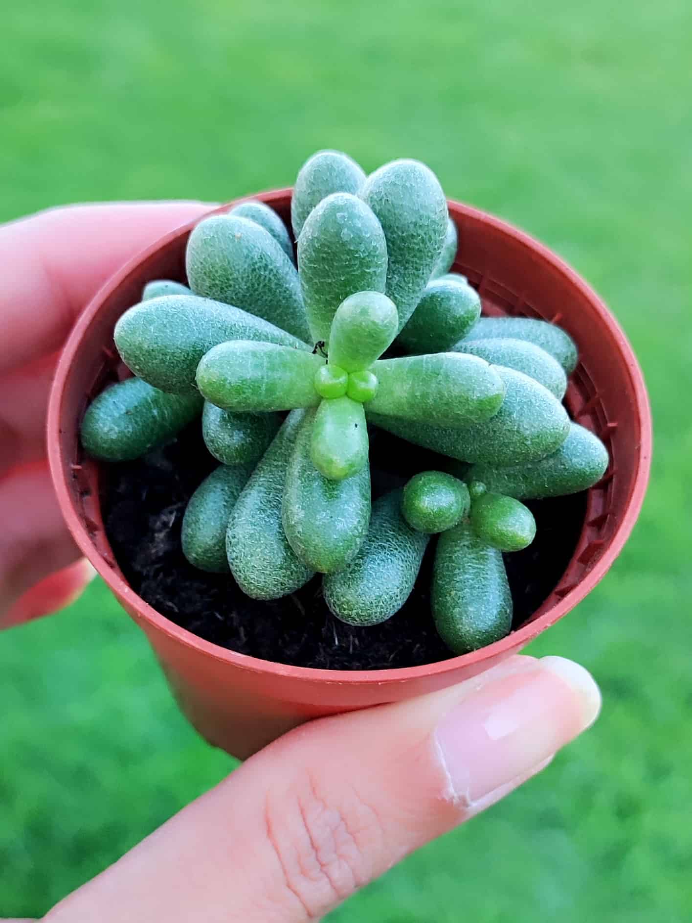El Sedum Hernandezii es una suculenta compacta de tallos gruesos y hojas cilíndricas de verde intenso, con textura aterciopelada y gran resistencia, ideal para colecciones o rincones soleados.